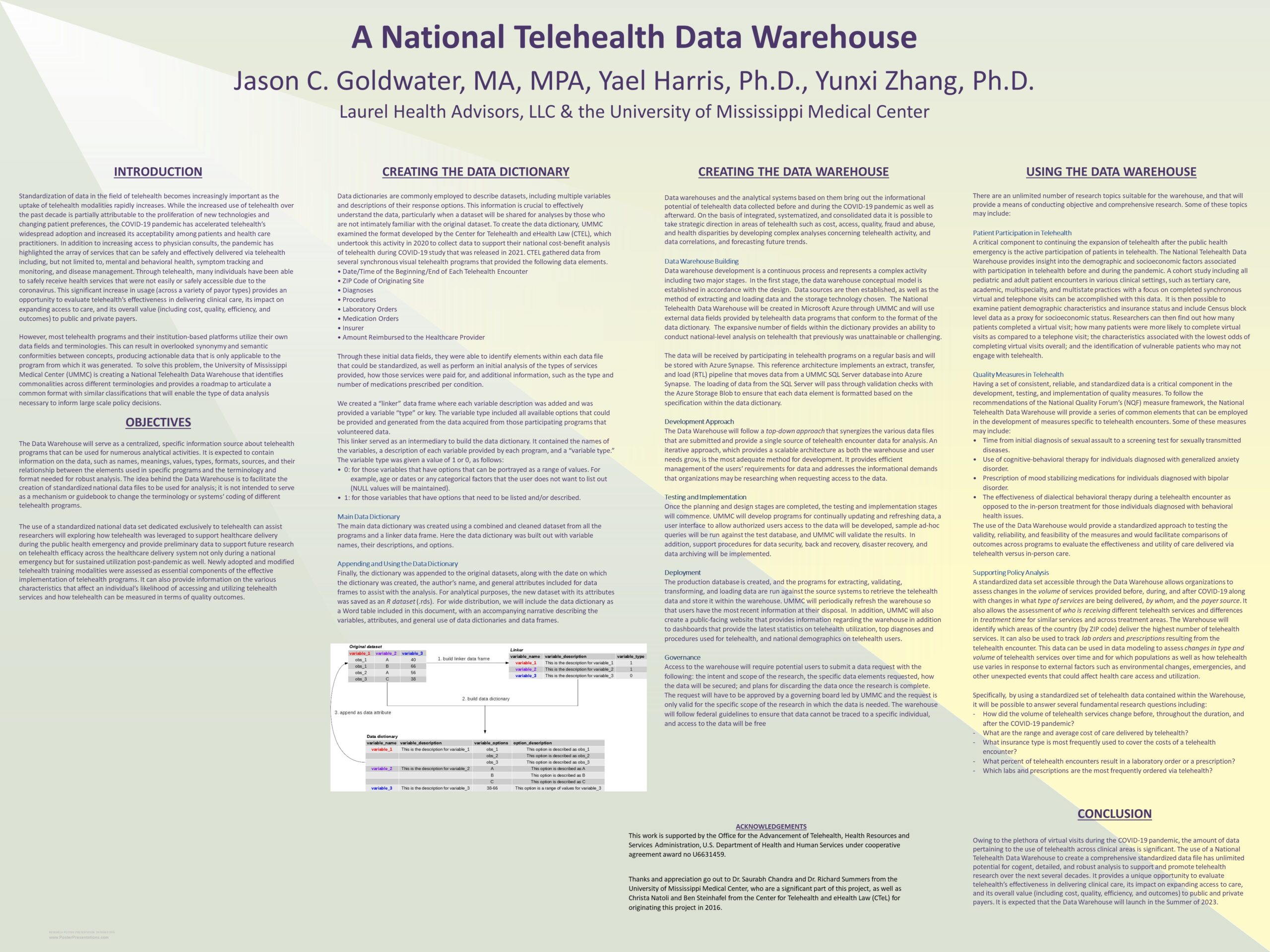 This project aims to construct a National Telehealth Data Dictionary to identify standard elements for the state-of-the-art telehealth programs. The National Telehealth Data Dictionary will be developed from the data dictionary published by the CTeL in 2020 and further identify more standard elements, e.g., demographic information, health outcome information, encounter information, and financial information, through a four stages cycle: revise the current data dictionary, gather data, assess data, and update data dictionary. Throughout the cycles, the National Telehealth Data Dictionary will be progressively expanded, repeatedly tested, and optimally modified to reflect telehealth programs and support standardized data aggregation.