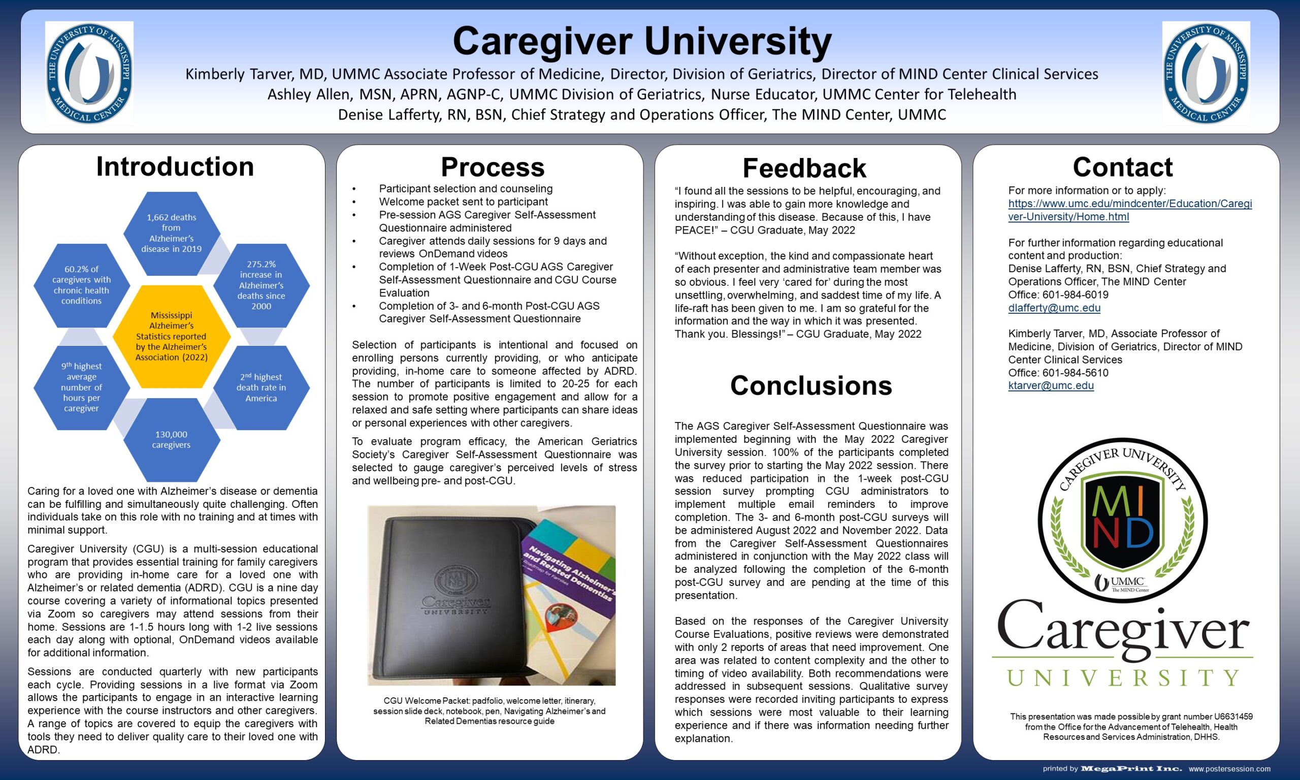 Caregiver University will be expanded to reach a more diverse audience of family caregivers in Mississippi and surrounding southeastern states thereby improving the quality of in-home care delivery for individuals battling Alzheimer’s Disease and Related Dementias (ADRD), promoting aging in place, and reducing caregiver stress and associated health risks.